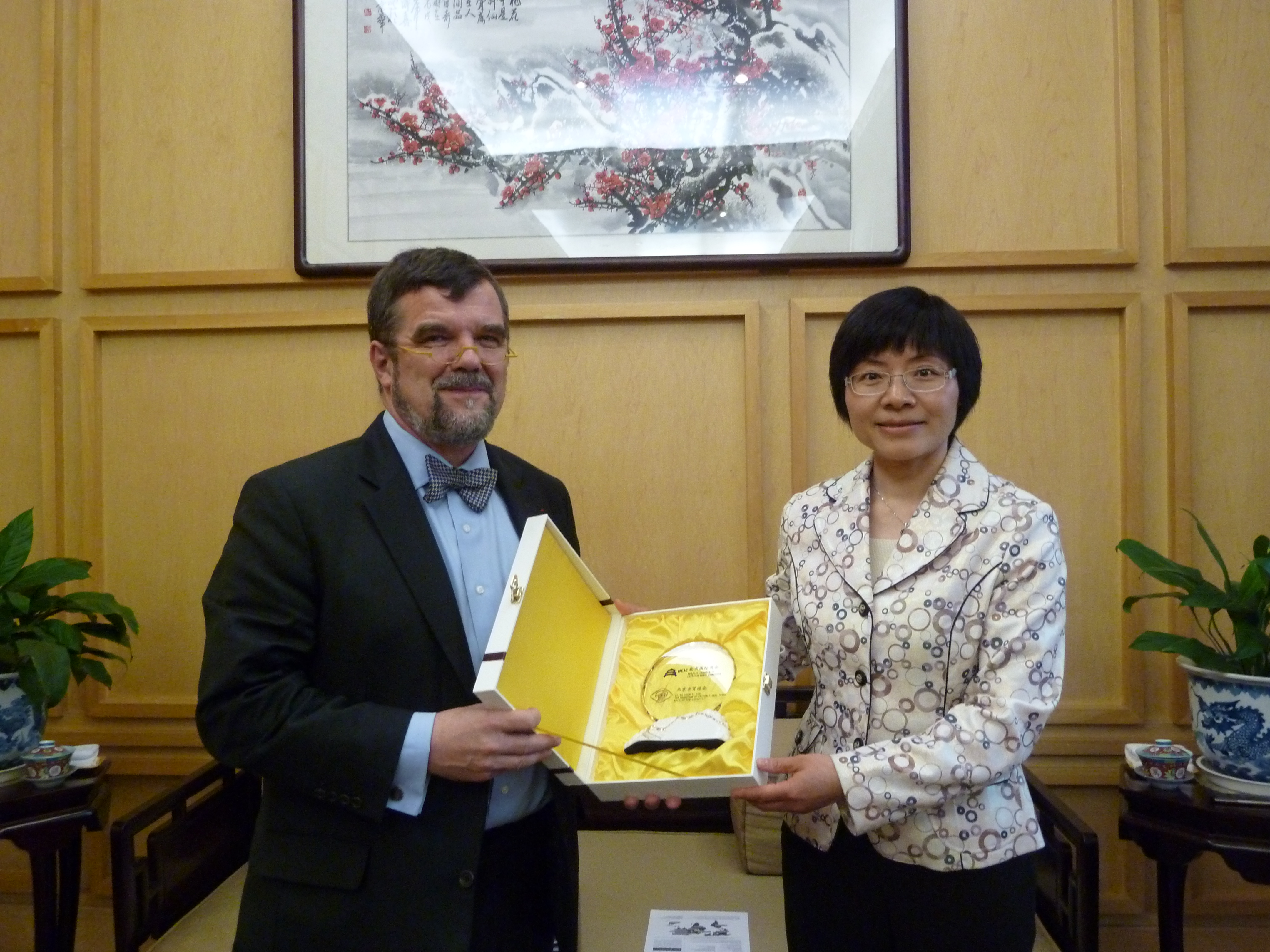 熊九玲会长首先祝贺凯意礼先生当选巴黎工商会会长,对他荣任会长后首次访问北京表示欢迎。熊九玲会长向客人介绍了北京市贸促会、北京国际商会的性质、主要职能及由我会承办的科博会、文博会等主要活动;介绍了目前正在筹办的“2011北京国际友好商会大会”,邀请凯意礼会长担任北京国际商会海外荣誉会长并届时出席大会。熊九玲会长指出,双方商会在经贸合作交流方面交流广泛,希望凯意礼先生发挥在文化、时尚界的影响力,进一步扩展合作领域,特别是会议、展览领域的合作,希望吸引法国设计时尚界有影响力的会展活动来北京举办。