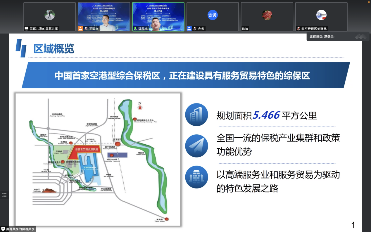 6月29日下午,我会、北京服务贸易协会、北京第二外国语学院经济学院共同举办了助力国际化人才培养系列活动——“走进北京天竺综合保税区”线上讲座。首都国际机场临空经济区(北京天竺综合保税区)管委会副主任满群杰、中国保税区出口加工区协会秘书长席艳荣及毕马威中国政府及公共服务部门的代表应邀到会,围绕“天竺综合保税区特色发展之路”、“我国综保区发展建设情况以及对构建新发展格局的战略意义”及“我国自贸试验区发展情况以及对国际化人才的需求”与大家进行了分享。