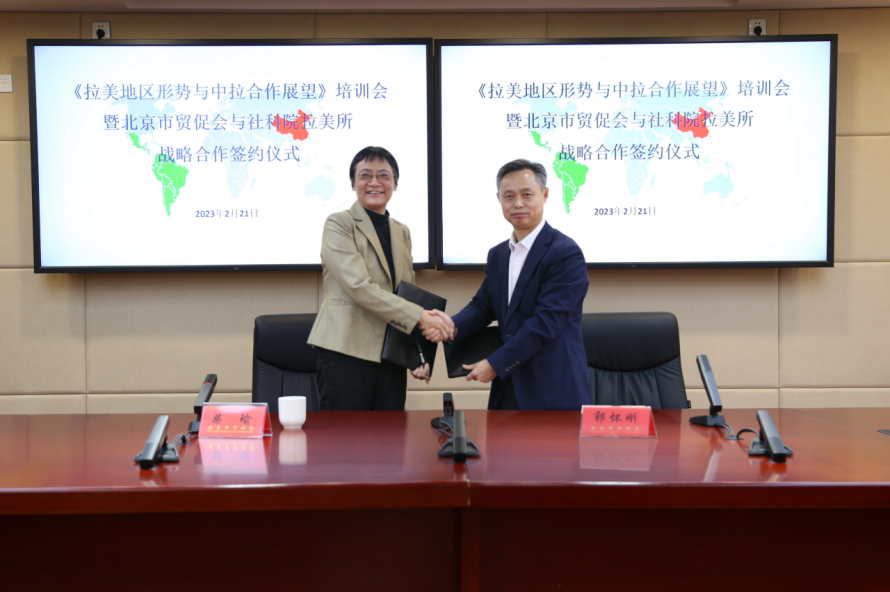 2月21日下午,北京市贸促会与中国社会科学院拉丁美洲研究所签署战略合作协议,通过加强联动合作,把社科院拉美所高端智库资源和市贸促会国际贸易投资促进机制作用有效结合,深入研究中拉经贸合作有关问题,高水平策划第十六届中国-拉美企业家高峰会,为促进首都高水平开放、加快国际交往中心功能建设贡献力量。北京市贸促会主任郭怀刚、中国社科院拉美所所长柴瑜在协议上签字。拉美所区域合作室主任杨志敏、副主任芦思姮,市贸促会副主任唐海蛟、吴岚岚、张秀峰及双方有关人员出席。