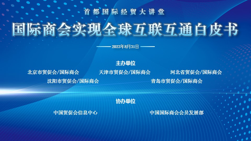 8月31日下午,我会与天津、河北、沈阳、青岛四地贸促会、国际商会共同主办“首都国际经贸大讲堂”系列培训—“国际商会实现全球互联互通白皮书”线上培训会,中国国际商会微信视频号同步直播。主协办单位、相关商协会及京内外企业代表近400人参加本次培训。