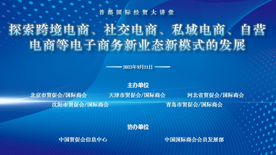 9月21日下午,北京市贸促会与天津、河北、沈阳、青岛四地贸促会、国际商会共同主办“首都国际经贸大讲堂”系列培训—“探索跨境电商、社交电商、私域电商、自营电商等电子商务新业态新模式的发展”线上培训会,中国国际商会微信视频号同步直播。主协办单位、相关商协会及企业代表300余人参加本次培训。