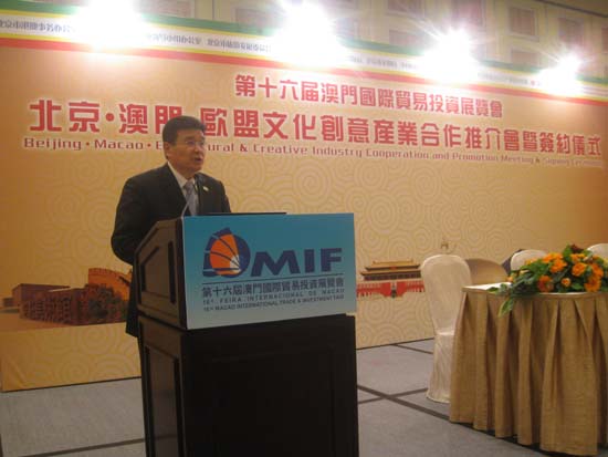 10月20日, 第十六届澳门国际贸易投资展览会在澳门开幕。我会倪跃刚副会长出席开幕式、展览活动并在“北京·澳门·欧盟文化创意产业合作推介会暨签约仪式”活动中推介北京文博会。