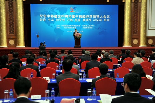 为庆祝中韩建交20周年,由中国国际贸易促进委员会和韩国大韩商工会议所共同举办的“纪念中韩建交20周年暨中韩经济界领导人会议”于2012年8月20日在北京饭店举行。全国政协副主席阿不来提•阿不都热西提、中国贸促会会长万季飞、韩国大韩商工会议所会长孙京植、韩国驻华大使李揆亨出席了会议并发表讲话。我会熊九玲会长出席了会议,林彬副会长陪同出席。中韩经济界代表近200人与会。