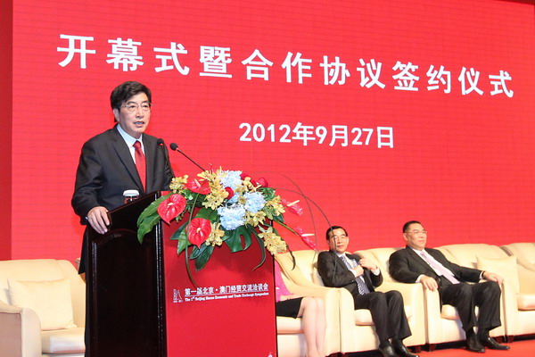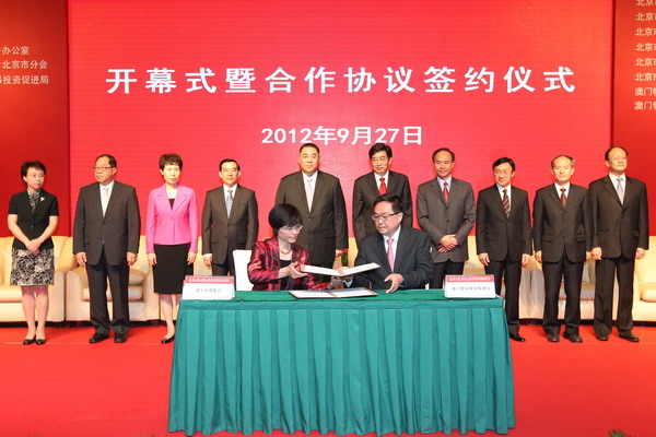 由北京市人民政府和澳门特别行政区政府共同主办,北京市政府港澳事务办公室、北京市贸促会和澳门贸易投资促进局承办的第一届北京•澳门经贸交流洽谈会(以下简称“京澳洽谈会”)五大板块各项活动已于2012年10月21日圆满闭幕。会议以“深化交流合作,促进共赢发展”为主题。中共北京市委书记郭金龙宣布第一届京澳洽谈会开幕。澳门特别行政区行政长官崔世安,中共北京市委副书记、代市长王安顺、国务院港澳办副主任周波、中央驻澳联络办副主任高燕、北京市副市长程红出席开幕式暨合作协议签约仪式。600余名澳门特别行政区政府代表、企业家、参展商,以及北京市相关委办局、区县、商协会代表分别参加了开幕式、合作签约、专题推介等活动,共同见证了京澳两地政府全面启动战略合作关系的历史篇章。