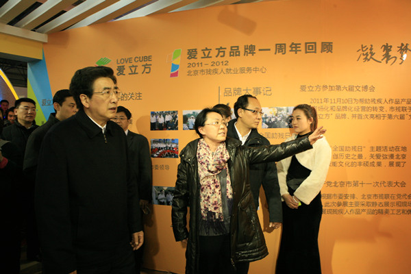 12月21日, 北京市委书记郭金龙亲临了文博会展场,并来到爱立方展位参观。郭书记勉励大家把独具民族特色的优秀传统文化传承弘扬,希望“将残疾人作品变成产品、将产品转化为商品,源源不断进入市场”,为残疾人谋福利。市委副书记、代市长王安顺,市领导赵凤桐、鲁炜、程红及北京市贸促会(北京国际商会)会长熊九玲等陪同郭书记一同参观。
