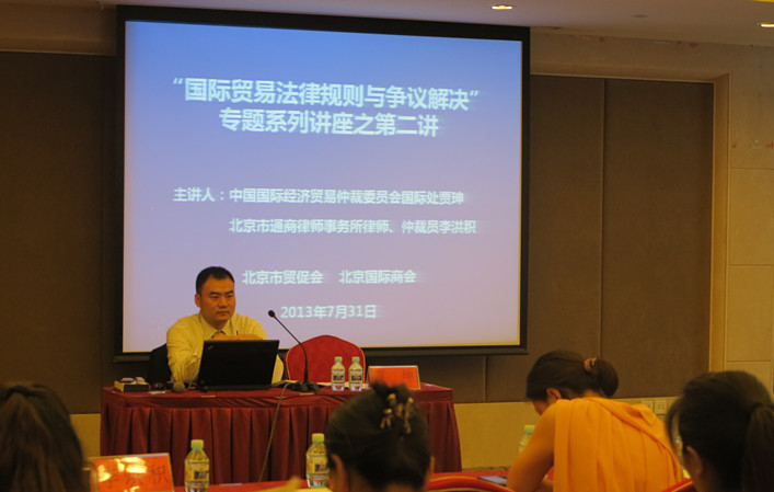 2013年7月31日下午,北京市贸促会、北京国际商会举办了“国际贸易法律规则与争议解决” 专题系列讲座之第二讲。北京国际商会、北京市进出口企业协会及相关外贸企业代表百余人参加了讲座。