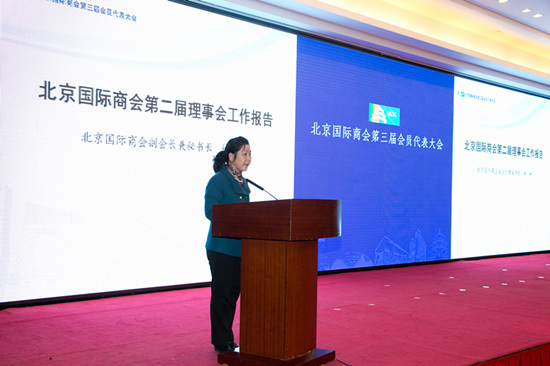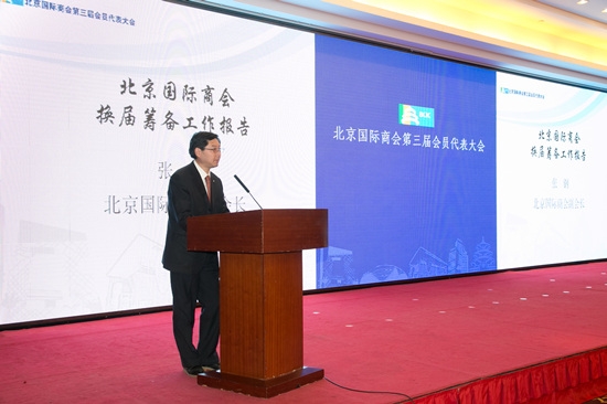 北京市贸促会副主任、北京国际商会副会长兼秘书长林彬做第二届理事会工作报告