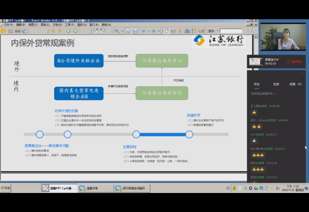 培训会上,江苏银行北京分行国际业务部总经理司睿琳围绕资金跨境的主要方式、三种常见的跨境担保融资方式及跨境融资风险管控,结合实例进行了系统、深入的讲解。交流会后,司总还与参会企业代表进行了充分的互动交流,详细解答了疫情全球蔓延对跨境担保融资的影响等十余个专业问题。