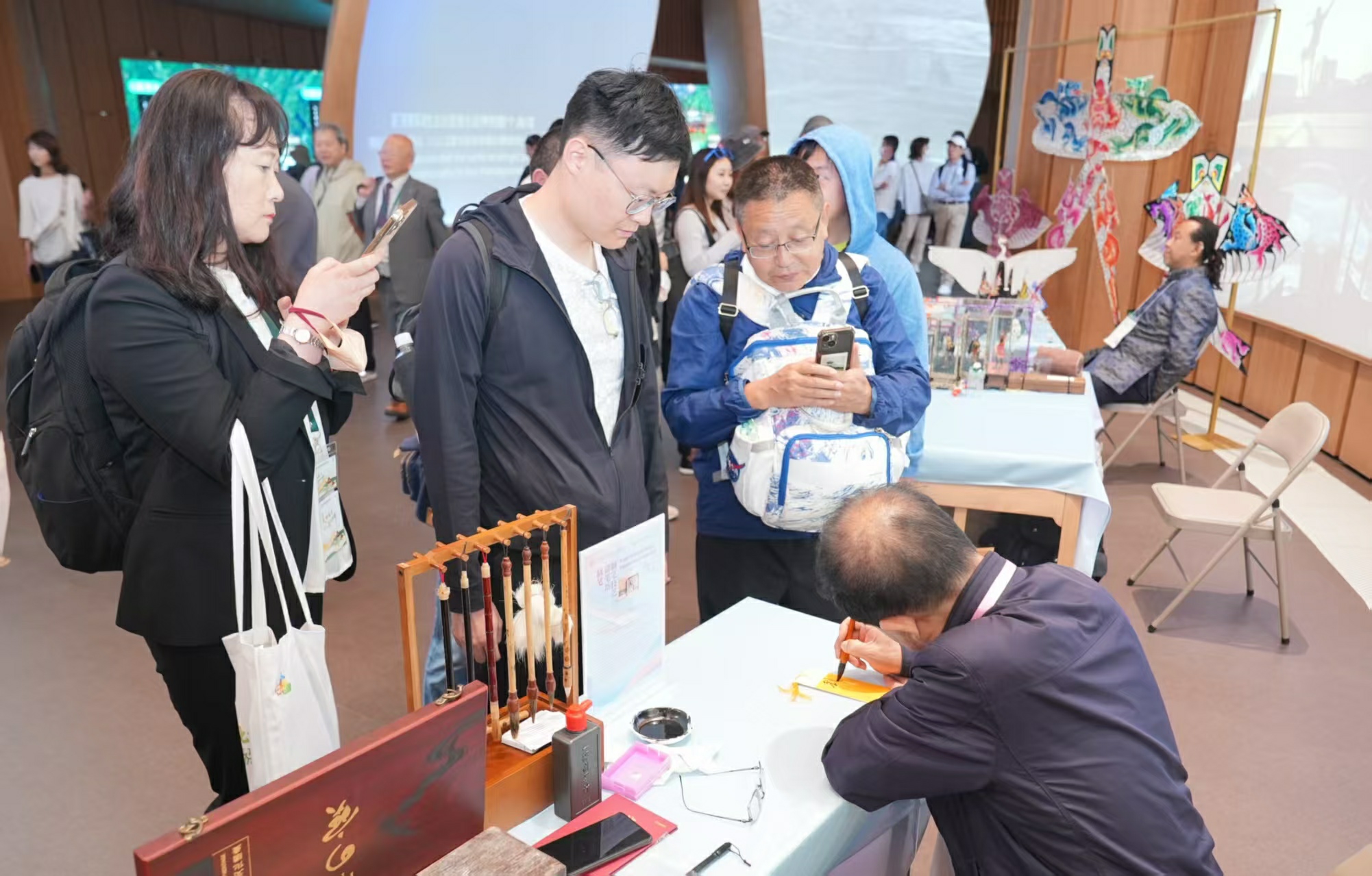 书林翰墨传友谊——中日书法交流会,中日书法家现场挥墨、互赠作品,并指导书法爱好者和现场游客进行书法体验,活动过程中播放AIGC(人工智能生成)书法体验短片《墨韵新生》,为书法传承开辟数字时代新维度,期间穿插非遗产品——北京“御笔坊”毛笔推介,加深现场观众对中国制笔工艺的了解和认知,近距离领略中国非遗魅力。